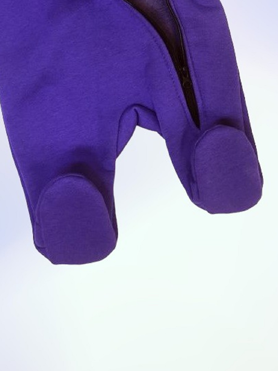 Комбинезон с закрытыми ножками, с капюшоном на подкладке, молния по всей длине и до конца одной ножки.