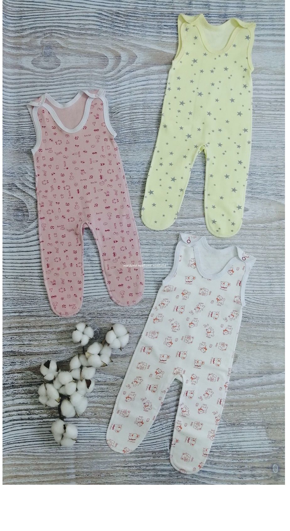 Ползунки выполнены из футера с начёсом. Ползунки высокие, на плечиках на кнопочках.